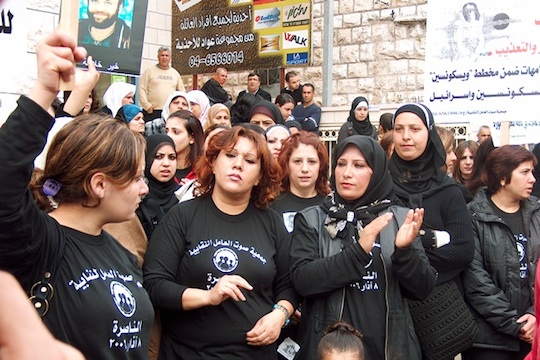 Nazareth – Security cameras and a heavy metal door secure the otherwise inconspicuous apartment. This is the office of the Arab Workers Union in Israel (AWU). Photographs of local demonstrations and flags of international trade unions drape the interior walls. Wehbe Badarneh, 43, from the village of Arabah, is the general secretary of the trade union. He prepared coffee over an open gas stove and offered freshly baked pastries. Fadwa Ali, 42, of the village of Kaukab Abu Al-Hija, arrived shortly after. Fadwa is one of the main organizers of the Women’s Platform, an affiliated section of the AWU. We sat down to discuss issues effecting Israeli Palestinian women workers, and the trade union’s related activities.