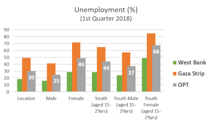 * Palestine data from Labour Force Survey, 1st Quarter 2018 (Jan-Mar), Palestinian Central Bureau of Statistics. “OPT”: occupied Palestinian territory (West Bank, Gaza Strip, East Jerusalem). “WB”: West Bank. “GS”: Gaza Strip.