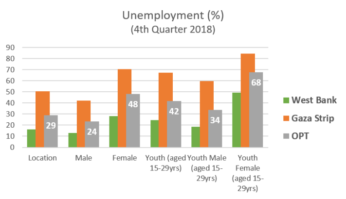 * Palestine data from Labour Force Survey, 4th Quarter 2018 (Oct-Dec), Palestinian Central Bureau of Statistics. “OPT”: occupied Palestinian territory (West Bank, Gaza Strip, East Jerusalem). “WB”: West Bank. “GS”: Gaza Strip.