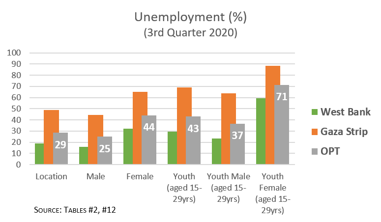* Palestine data from Labour Force Survey, 3rd Quarter 2020 (Jul-Sep), Palestinian Central Bureau of Statistics. “OPT”: occupied Palestinian territory (West Bank, Gaza Strip, East Jerusalem). “WB”: West Bank. “GS”: Gaza Strip.
