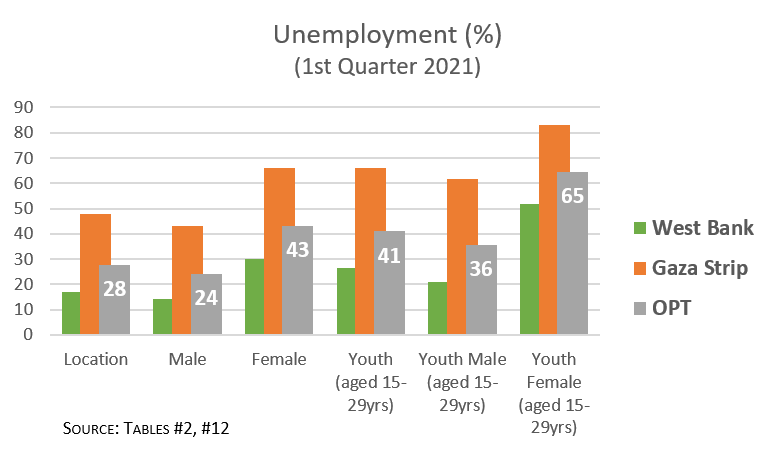 * Palestine data from Labour Force Survey, 1st Quarter 2021 (Jan-Mar), Palestinian Central Bureau of Statistics. “OPT”: occupied Palestinian territory (West Bank, Gaza Strip, East Jerusalem). “WB”: West Bank. “GS”: Gaza Strip.