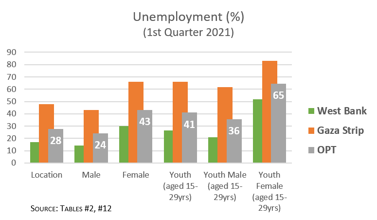 * Palestine data from Labour Force Survey, 1st Quarter 2021 (Jan-Mar), Palestinian Central Bureau of Statistics. “OPT”: occupied Palestinian territory (West Bank, Gaza Strip, East Jerusalem). “WB”: West Bank. “GS”: Gaza Strip.