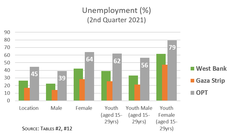 * Palestine data from Labour Force Survey, 2nd Quarter 2021 (Apr-Jun), Palestinian Central Bureau of Statistics. “OPT”: occupied Palestinian territory (West Bank, Gaza Strip, East Jerusalem). “WB”: West Bank. “GS”: Gaza Strip.