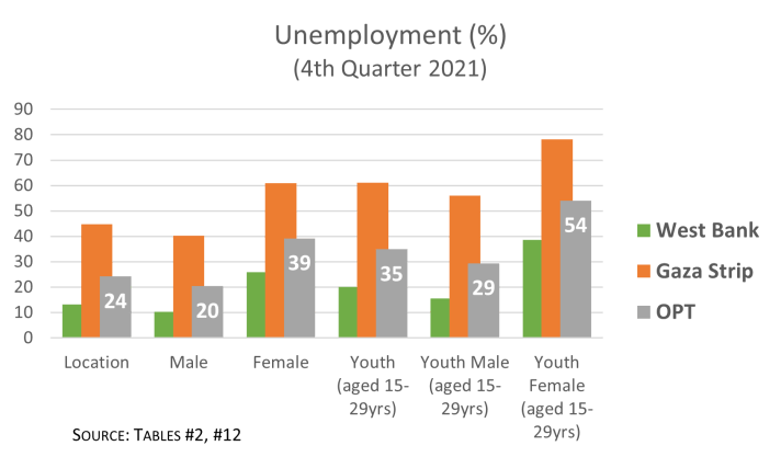 * Palestine data from Labour Force Survey, 4th Quarter 2021 (Oct-Dec), Palestinian Central Bureau of Statistics. “OPT”: occupied Palestinian territory (West Bank, Gaza Strip, East Jerusalem). “WB”: West Bank. “GS”: Gaza Strip.
