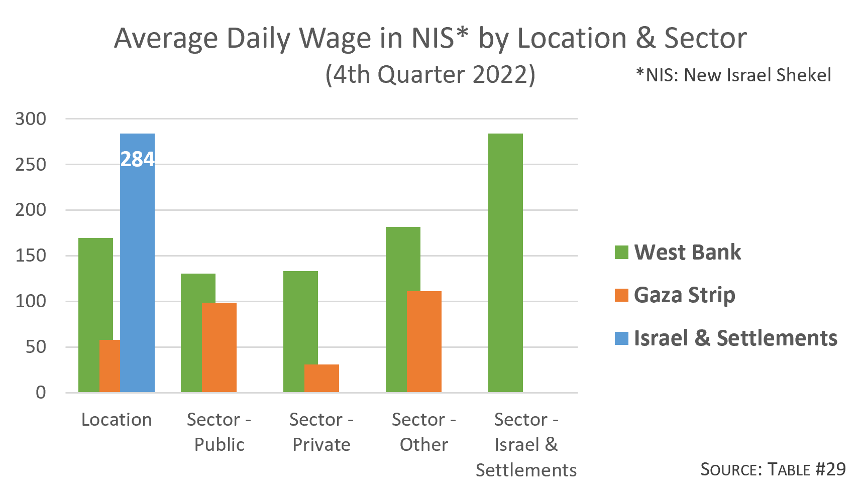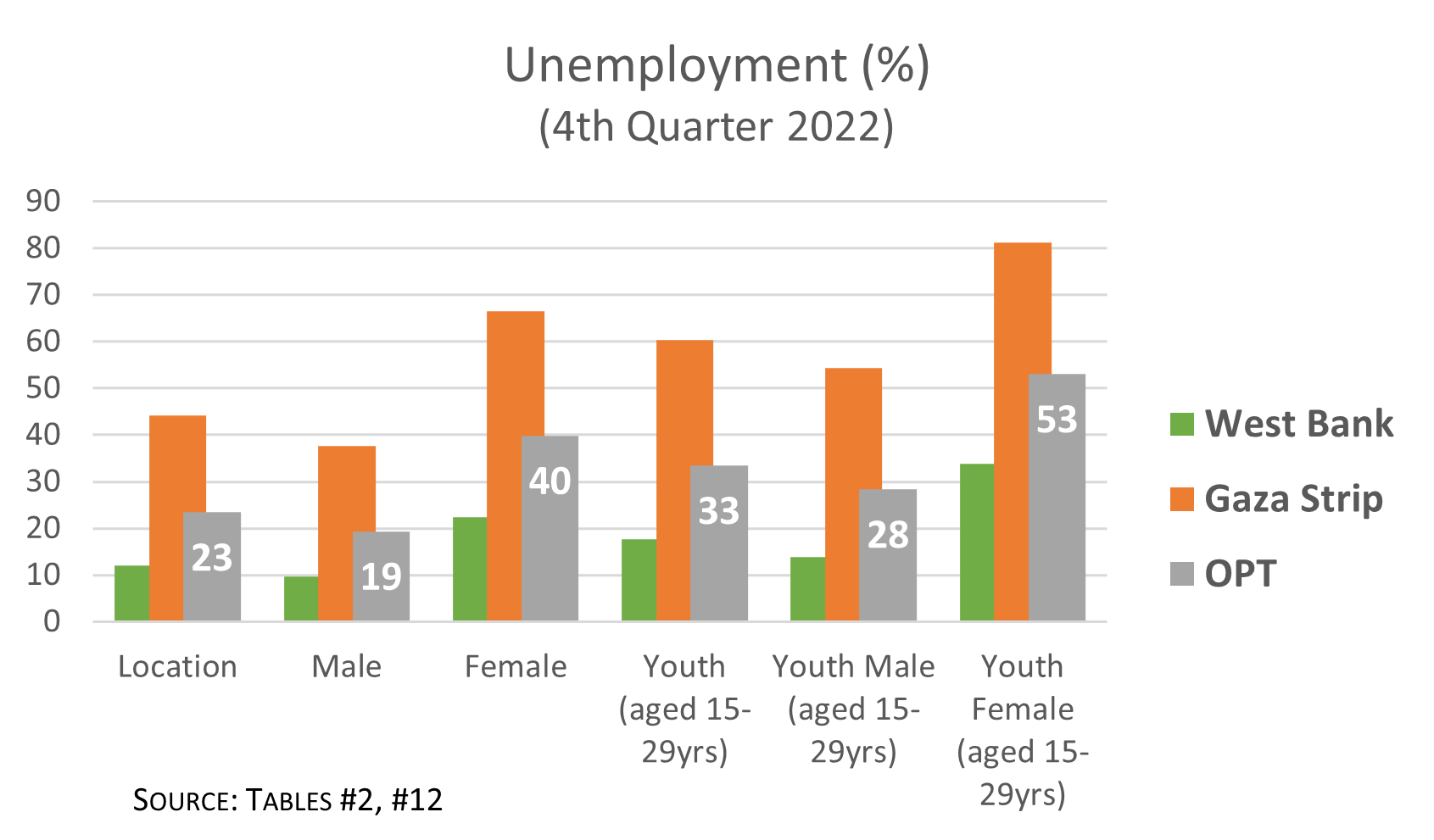 * Palestine data from Labour Force Survey – 4th Quarter 2022 (Oct-Dec), Palestinian Central Bureau of Statistics. “OPT”: occupied Palestinian territory (West Bank, Gaza Strip, East Jerusalem). “WB”: West Bank. “GS”: Gaza Strip.