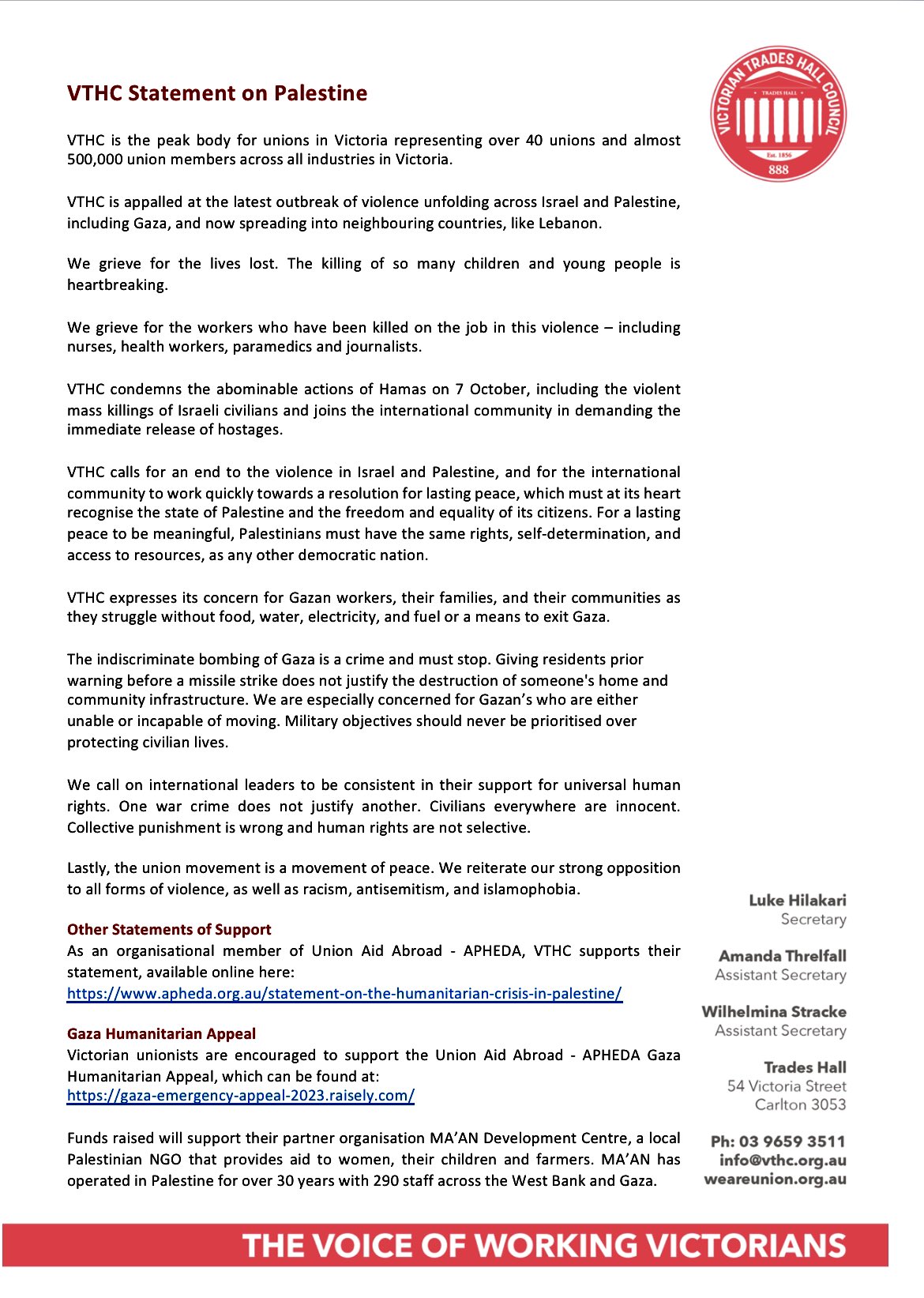As an organisational member of Union Aid Abroad – APHEDA, VTHC supports their statement, available online here.